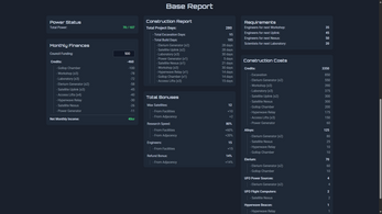 - Automatic report of many other things, including all of your Bonuses from your buildings (including separate counts for your actual Building bonuses versus how much of it is from Adjacency bonuses), how many Credits/Alloys/Elerium/etc. buildings cost, the amount of Engineers/Scientists required for additional Workshops/Laboratories, and even a Monthly Finances calculator with an editable monthly income box so you can know how much you'll be adding/losing if you launch a satellite or lose a member of the Council.
